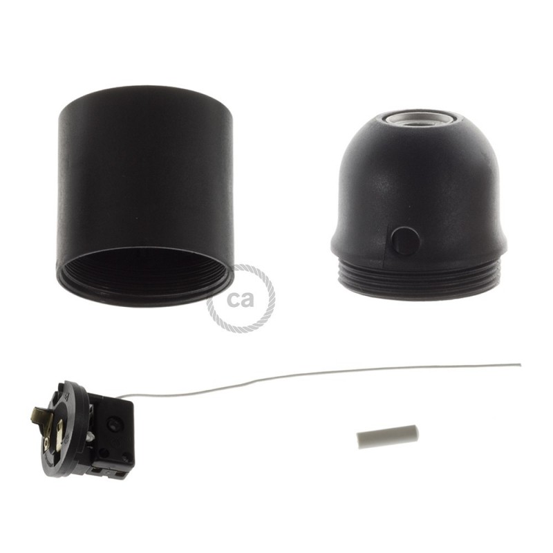 Termoplastično grlo za žarulju E27 s prekidačem i dva navojna prstena za montažu sjenila koristi se za sastavljanje zidnih, stolnih ili stropnih svjetiljki opremljenih sa sjenilom.