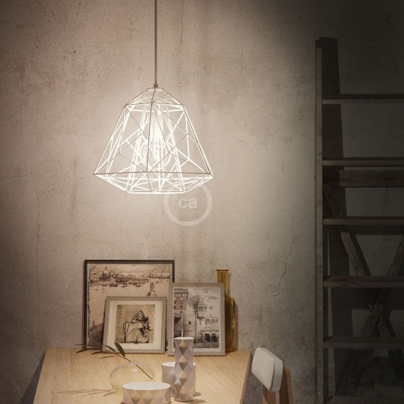 Metalni kavez Apollo savršen je za izradu lustera minimalističkog i elegantnog dizajna. Njegovi poligoni, napravljeni ručnim savijanjem metala, savršeni su za držanje i naglašavanje ukrasne žarulje, poput Globo G95 s dugim nitima.