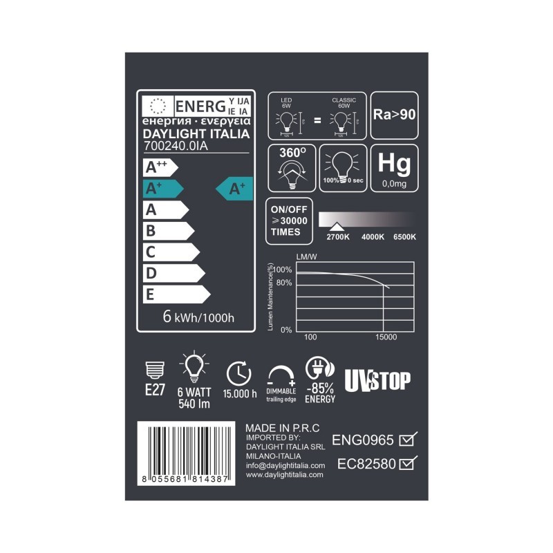Površina ove žarulje je bijela i glatka poput porculana: ovaj dragocjeni rezultat dobiva se nakon dvostrukog tretmana satiniranja koji uključuje i vanjsku i unutarnju površinu.