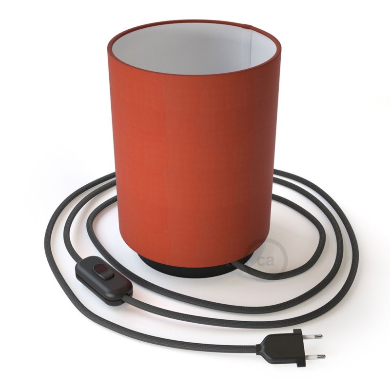 Crna metalna Posaluce lampa s narančastim platnenim Cylinder sjenilom isporučuje se u kompletu sa tamno sivim RM26 platnenim kabelom, te je opremljena prekidačem i utikačem od 2 pola.