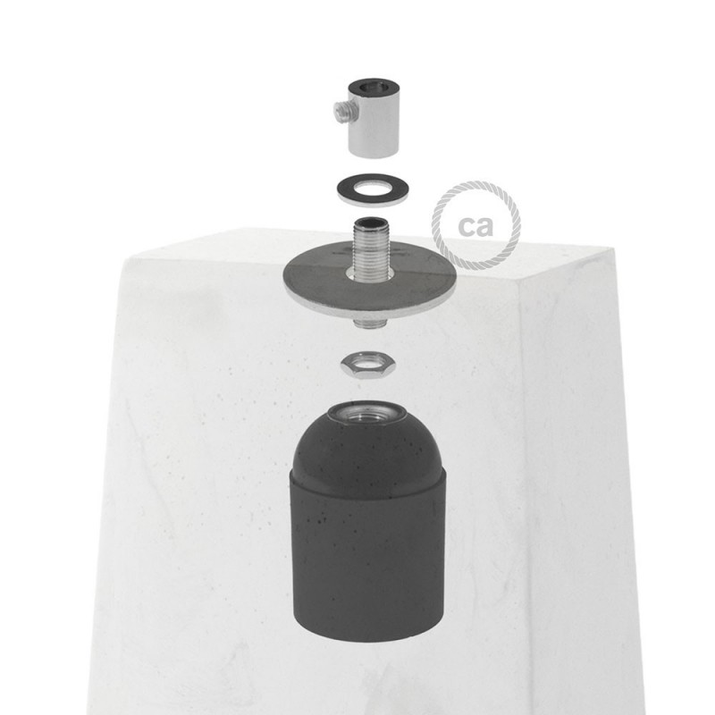 Cement Prisma lampshade comes with a set consisting of threaded rod and washers, cable retainer and a grounded smooth bakelite E27 lamp holder, IMQ certified.