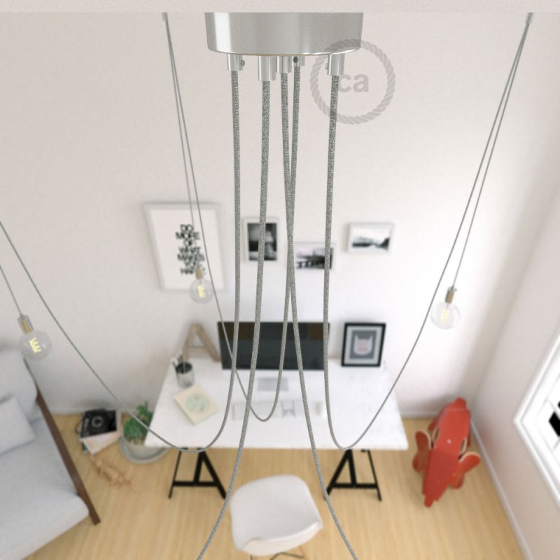 Viseća lampa “Metal Spider”, je sjajan proizvod kompanije Creative-Cables, koju možete oblikovati po vašoj želji: možete je montirate s konusnim ili cilindričnim kablovskim obujmicama i izabrati metalne kljukice ili decentralizirane kabele za pričvršćivanje na strop. Osim toga, Pauk možete kupiti u kompletu “URADI SAM” ili s već montiranim pojedinačnim visećim lampama.