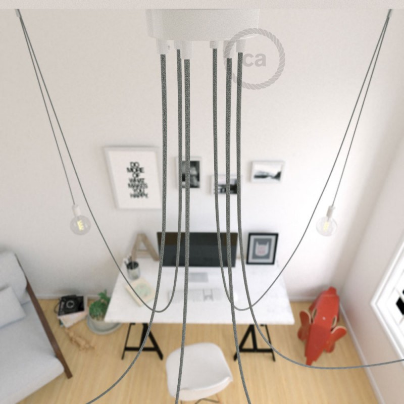 Viseća lampa “Metal Spider”, je sjajan proizvod kompanije Creative-Cables, koju možete oblikovati po vašoj želji: možete je montirate s konusnim ili cilindričnim kablovskim obujmicama i izabrati metalne kljukice ili decentralizirane kabele za pričvršćivanje na strop. Osim toga, Pauk možete kupiti u kompletu “URADI SAM” ili s već montiranim pojedinačnim visećim lampama.