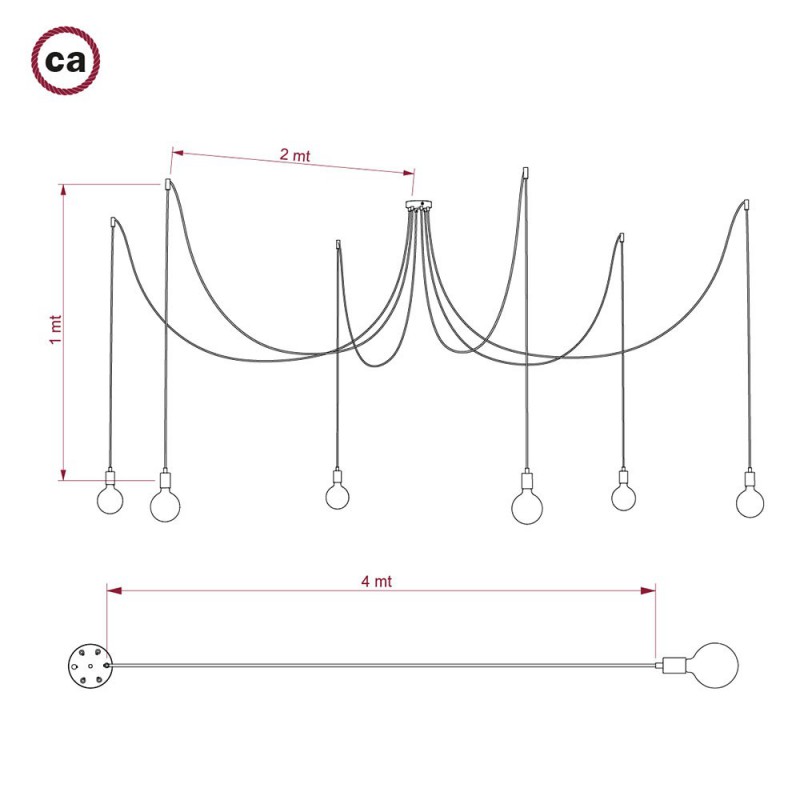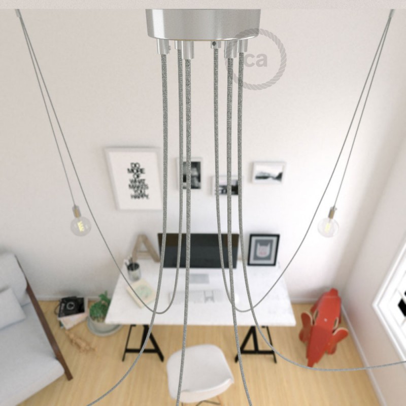 Viseća lampa “Metal Spider”, je sjajan proizvod kompanije Creative-Cables, koju možete oblikovati po vašoj želji: možete je montirate s konusnim ili cilindričnim kablovskim obujmicama i izabrati metalne kljukice ili decentralizirane kabele za pričvršćivanje na strop. Osim toga, Pauk možete kupiti u kompletu “URADI SAM” ili s već montiranim pojedinačnim visećim lampama.