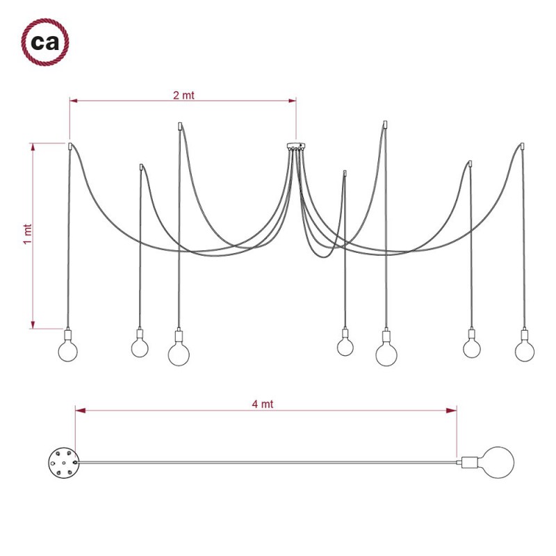Viseća lampa “Metal Spider”, je sjajan proizvod kompanije Creative-Cables, koju možete oblikovati po vašoj želji: možete je montirate s konusnim ili cilindričnim kablovskim obujmicama i izabrati metalne kljukice ili decentralizirane kabele za pričvršćivanje na strop. Osim toga, Pauk možete kupiti u kompletu “URADI SAM” ili s već montiranim pojedinačnim visećim lampama.