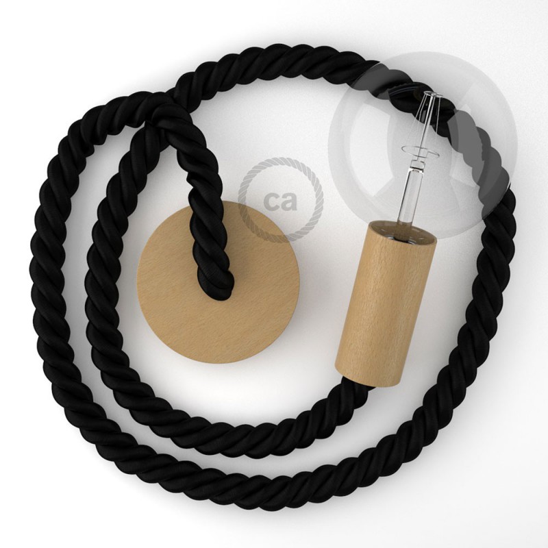 Viseća lampa izrađena od drveta, set s omotanim 2XL 24mm tekstilnim kabelom, prekrivenim s crnim sjajnim tekstilom, Made in Italy