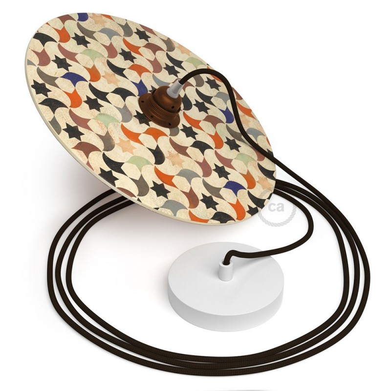 UFO Viseća lampa s dvostranim drvenim sjenilom s ilustracijama od strane Marika Marconcini s kabelom RM13 braoni metalnim držačem Exclusive E27 Rust boje hrđe s bisernom završnom obradom.