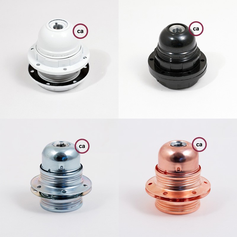 E27 grlo s dva navojna prstena: u bijeloj / crnoj bakelitnoj izvedbi ili kromiranoj / pobakrenoj metalnoj verziji.