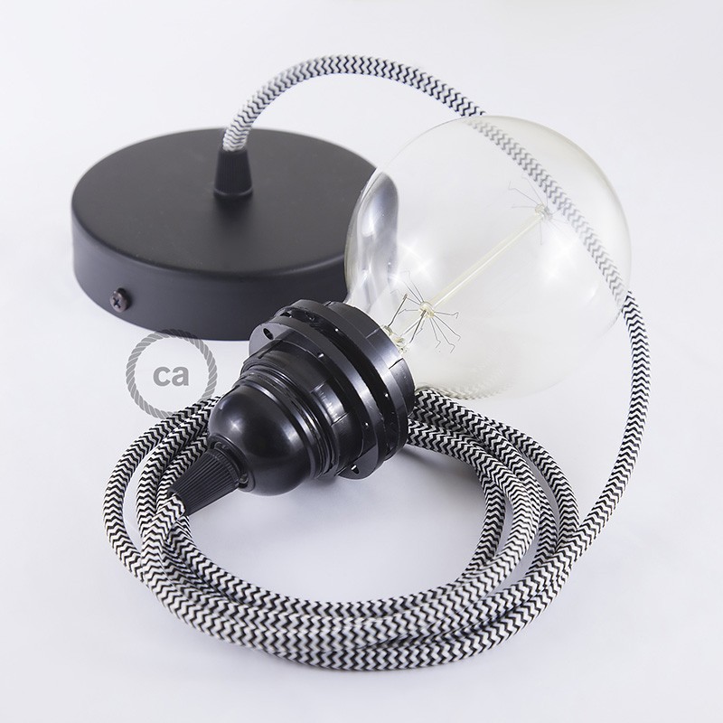 Sastavi viseću lampu sa sjenilom s tekstilnim kabelom RZ04 Cik-Cak Crni Okrugli rajon. Odaberite boju grla i rozete, dužinu kabela i da li želite već sastavljenu lampu ili u kompletu DIY "sastavi sam".